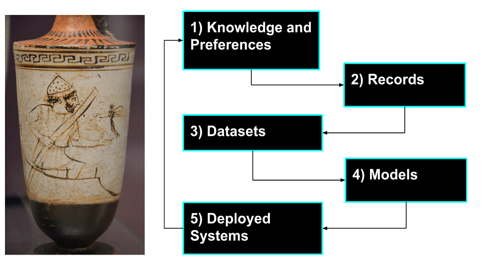 - We should consider all the stages involved in creating data for AI: Our knowledge and values (Stage 1) are translated into records (Stage 2), aggregated into datasets (Stage 3), and used to fit models (Stage 4). These models are deployed in systems (Stage 5) that impact the world.