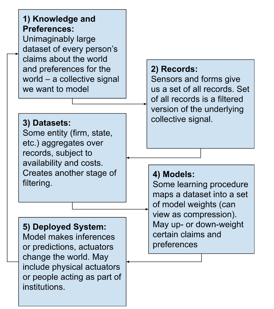 In this series, we will lay out a five stage model of the “Data Pipeworks”. This model is meant to describe (with considerable use of approximation) how human knowledge and values (stage 1) emerge from the physical world, lead to the creation of records (stage 2) that are aggregated into datasets (stage 3), which are compressed into input-output mapping models (stage 4) embedded into deployed systems (stage 5) that can be connected to actuators that do things in the world. Typically, deployed systems aim to create value for whoever built the system, but also create externalities, and will also create feedback loops by changing the world itself.